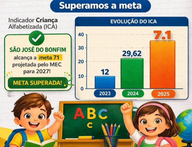 Mais uma grande conquista para a educação de São José do Bonfim. Os novos dados do Índice de Criança Alfabetizada, divulgados pelo MEC, mostram que o município segue avançando e fazendo história. São José do Bonfim alcançou 71% de crianças alfabetizadas na idade certa. Meta projetada pelo MEC para 2027.